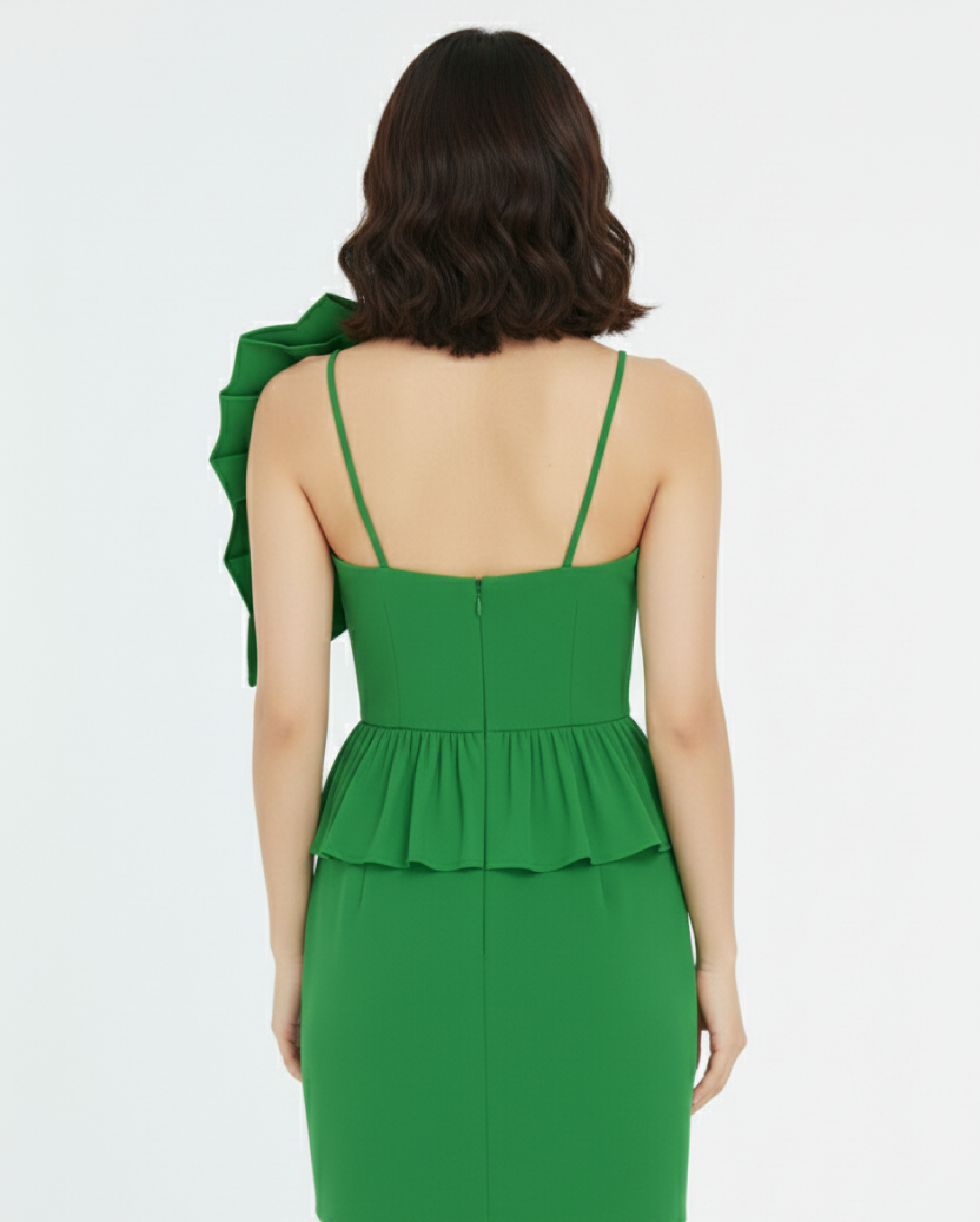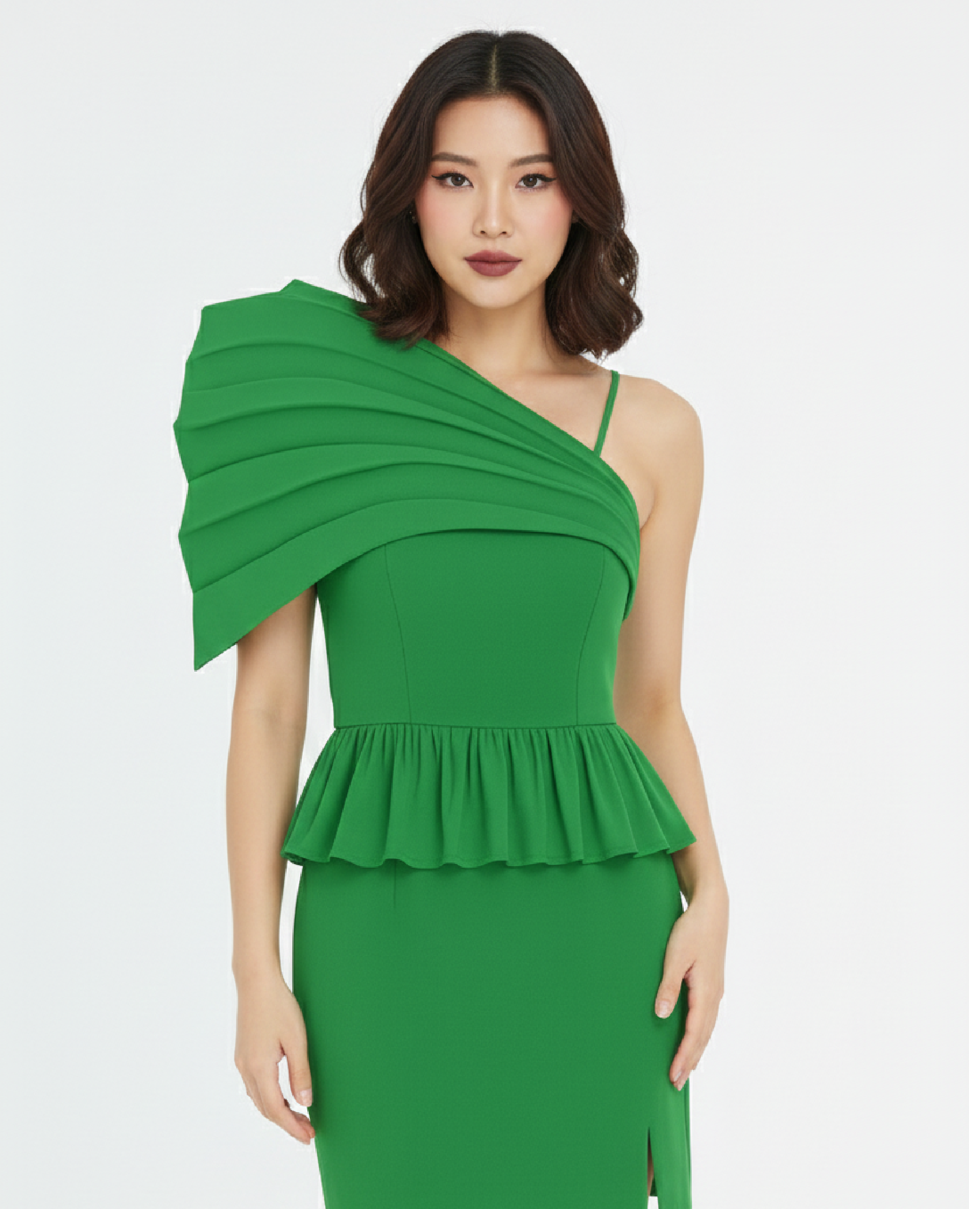 Coupe asymétrique audacieuse : Une seule bretelle sur l’épaule droite, équilibrée par un spectaculaire volant plissé qui s’étend de l’épaule gauche jusqu’au buste.