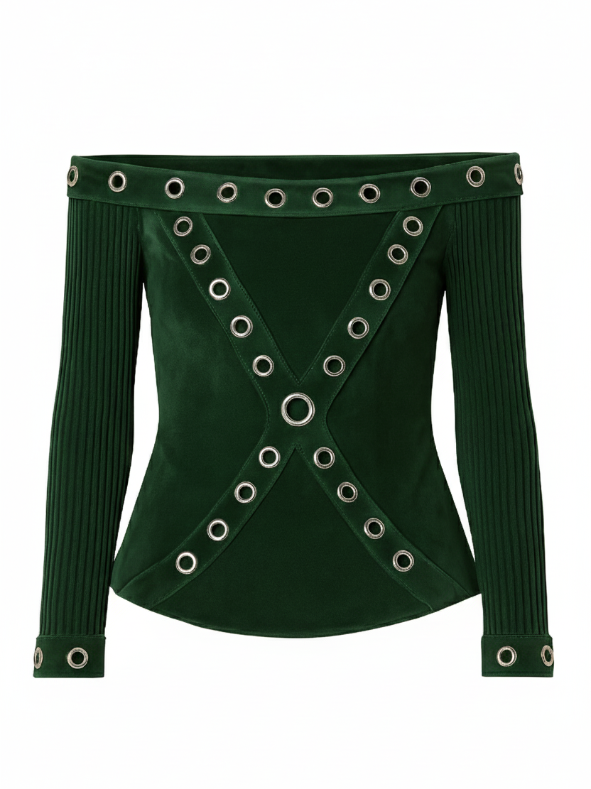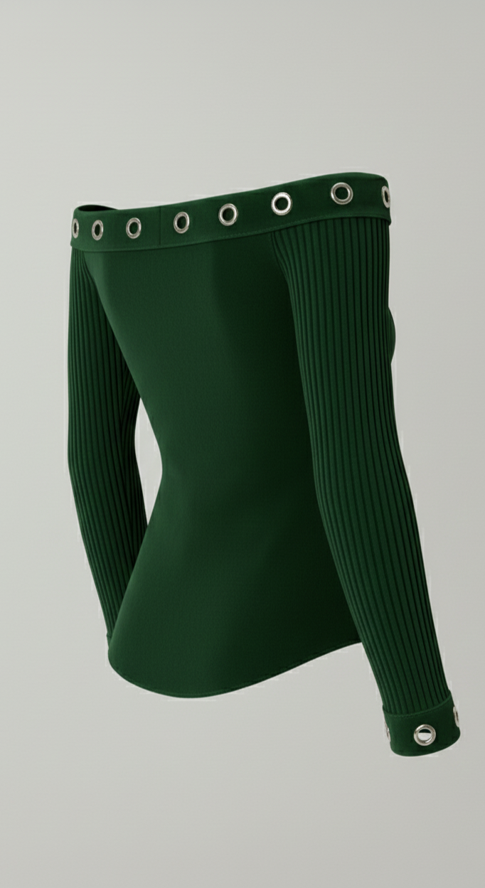 L’industriel rencontre le couture. Ce haut structuré à épaules dénudées incarne une esthétique avant-gardiste, où les détails métalliques deviennent éléments graphiques. Sa construction en X et ses finitions côtelées en font une pièce sculpturale, pensée pour les silhouettes affirmées.