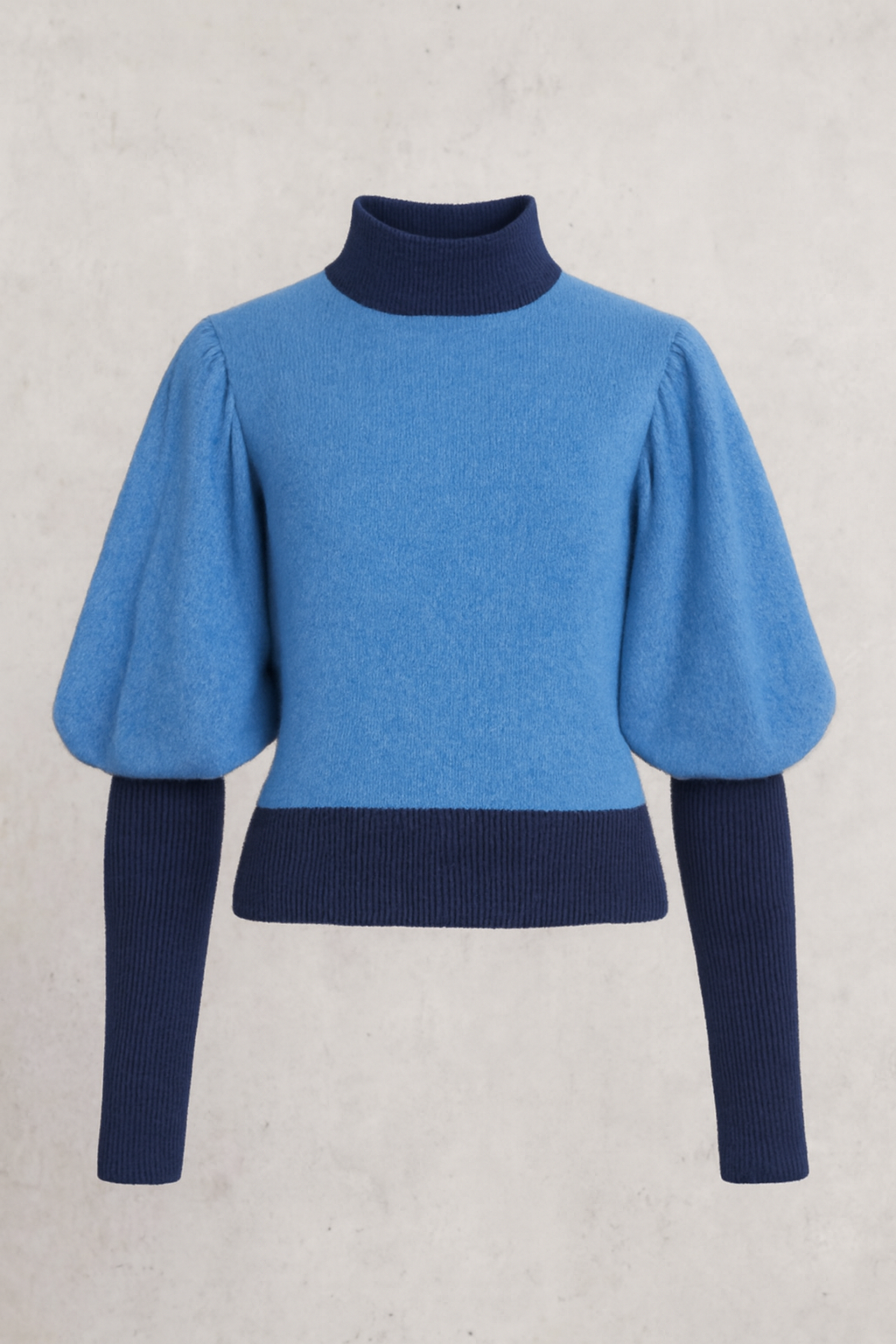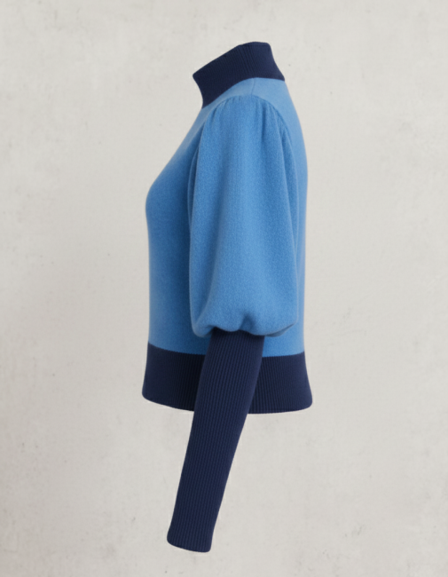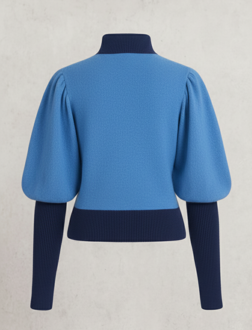 Manches : Design double – manches courtes bouffantes en bleu ciel surmontées de manches longues ajustées en bleu marine, créant un effet superposé graphique