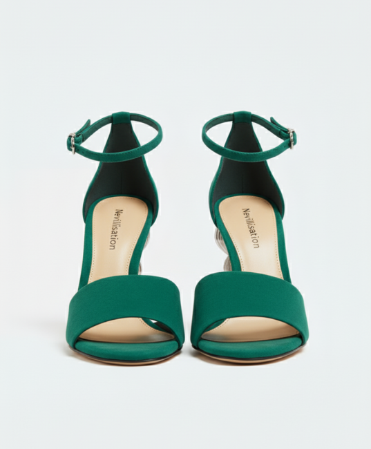 Matériaux : Tissu technique émeraude, talon en résine translucide et métal doré