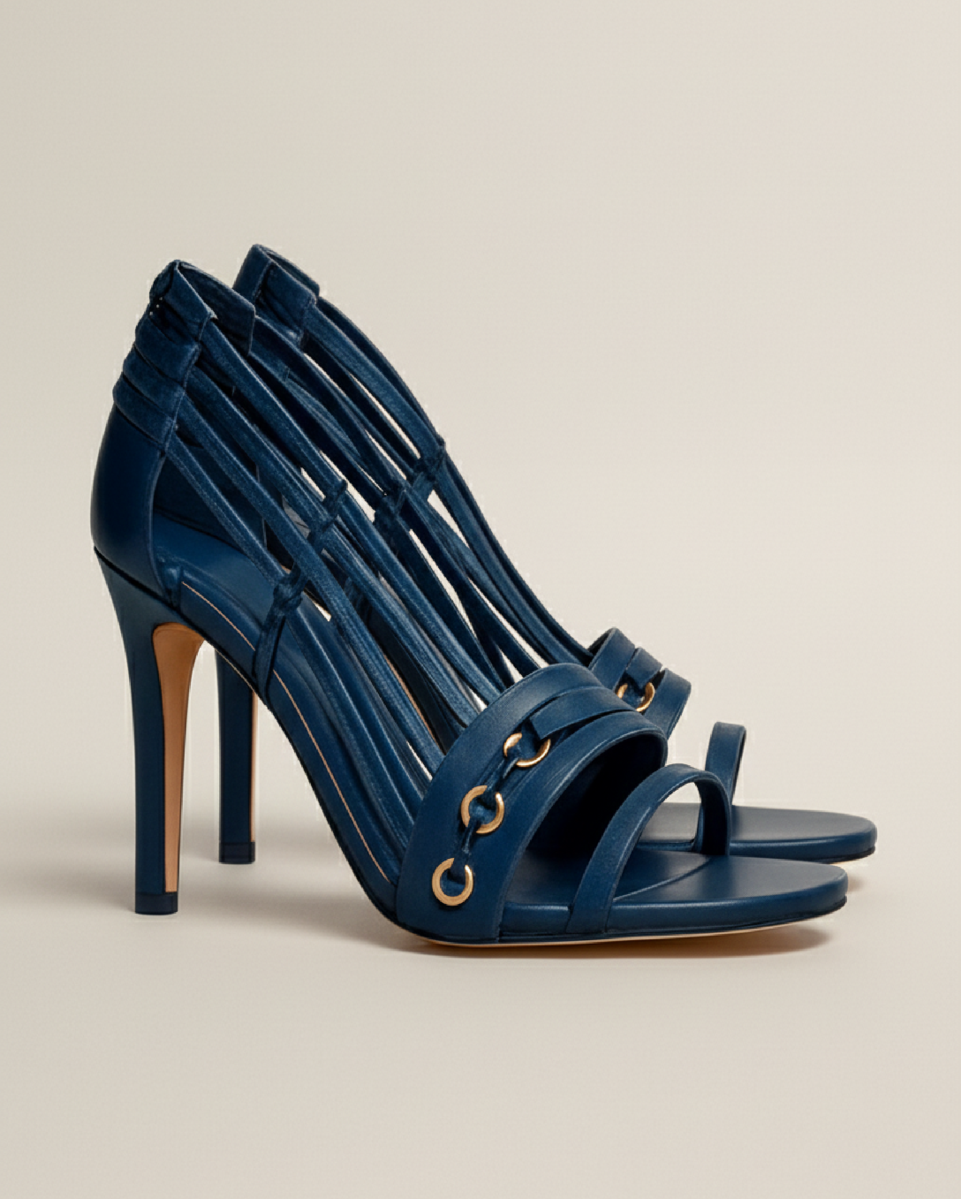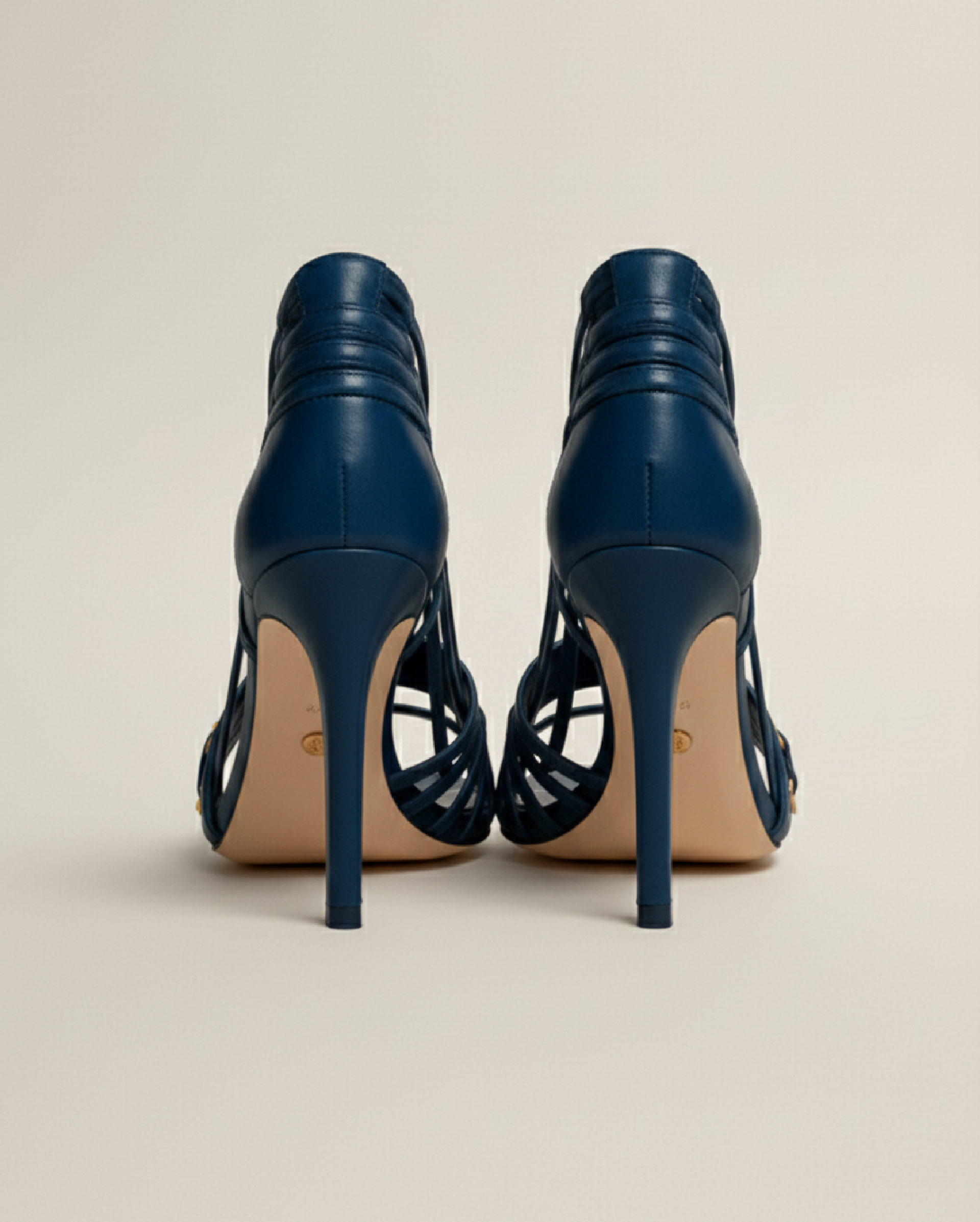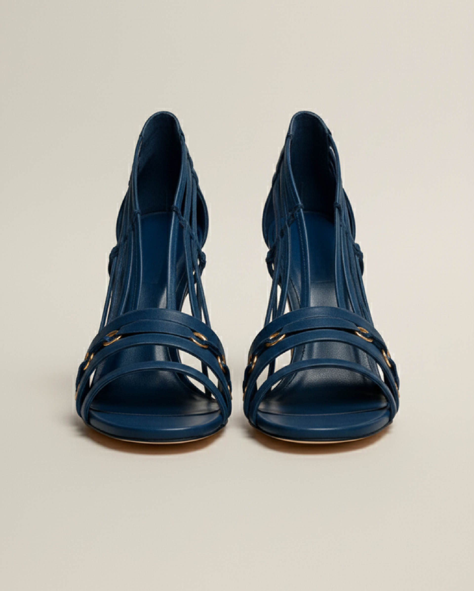 L’élégance graphique au service du glamour. Ces sandales bleu nuit conjuguent minimalisme et structure avec une touche industrielle chic. Leur design en cage et leurs finitions métalliques en font une pièce forte, pensée pour les silhouettes affirmées et les soirées stylisées.